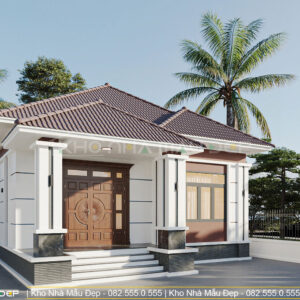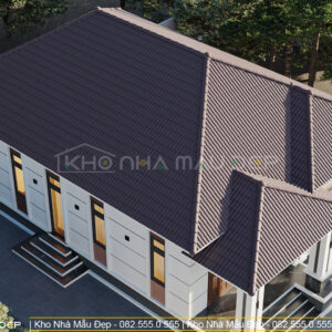 Ngôi nhà mang đậm phong cách hiện đại, nổi bật với hình khối cân đối, mái ngói dốc nhẹ và độ vươn rộng giúp che mưa nắng hiệu quả. Tông màu chủ đạo thường là trắng – ghi – nâu, kết hợp cùng các chi tiết ốp đá chân tường tạo điểm nhấn sang trọng. Hệ cửa nhôm kính được bố trí hợp lý, tận dụng tối đa ánh sáng tự nhiên, mang đến không gian sống sáng sủa và gần gũi với thiên nhiên.