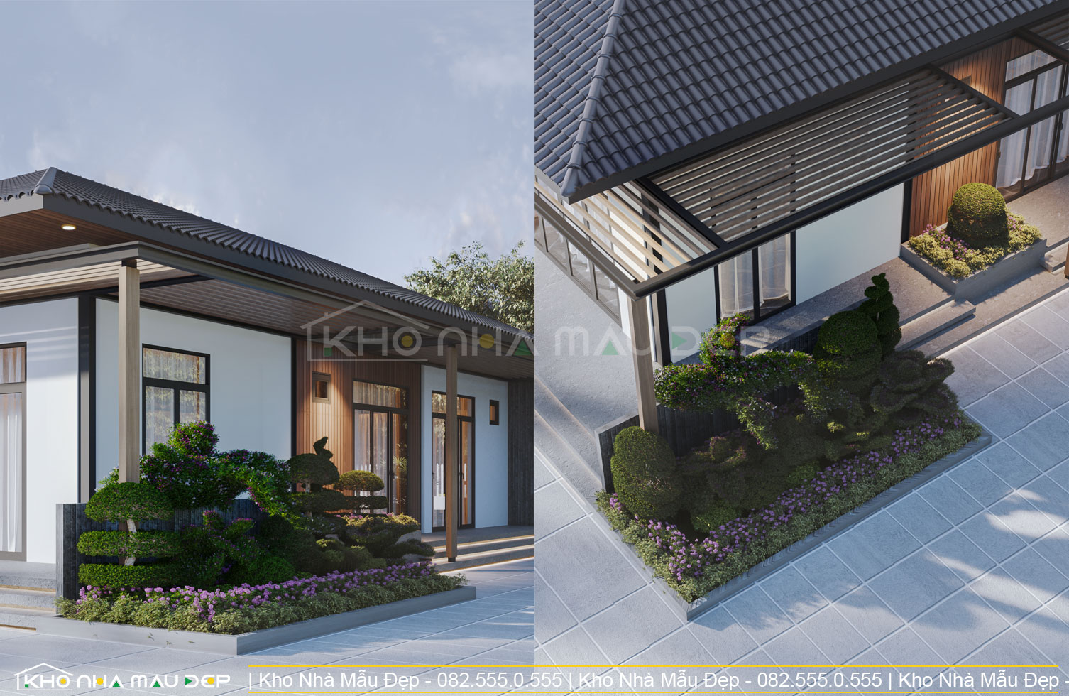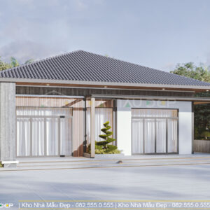 Ngôi nhà mang phong cách hiện đại, kết hợp vật liệu lắp ghép bền chắc, thân thiện với môi trường. Mái Nhật tạo sự thanh thoát, sang trọng. Hệ cửa kính lớn giúp lấy sáng tự nhiên, mở rộng tầm nhìn ra không gian sân vườn xanh mát. Mặt tiền nhấn nhá bằng gỗ ốp và cây cảnh tạo điểm nhấn hài hòa, mang lại vẻ đẹp vừa hiện đại vừa gần gũi.